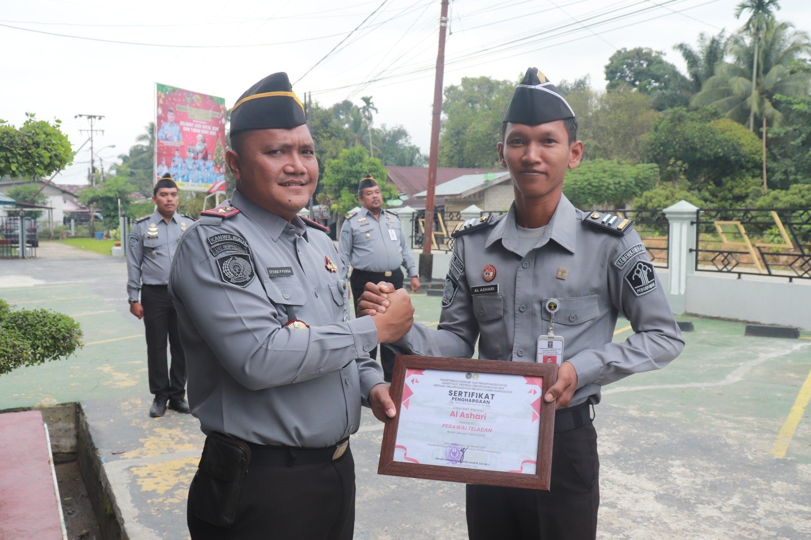 Pasir Pangaraian, Thilasia.id– Dalam agenda apel pagi rutin pegawai Lapas Pasir Pangarayan, Kepala Lapas Kelas IIB Pasir Pangaraian, Efendi Parlindungan Purba sematkan tanda kenaikan pangkat pegawai dan berikan penghargaan kepada pegawai teladan atau Best Employee untuk periode bulan januari Tahun 2025 pada Selasa (04/02/2025).