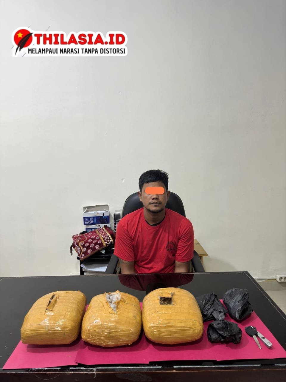 Tersangka yang diamankan adalah IL alias IN Bin SM (32), Warga Kota Kisaran, Sumatera Utara. Dari tangan pelaku, polisi berhasil menyita 3 paket besar narkotika jenis daun ganja kering dgn berat kotor 3.130 (tiga ribu seratus tiga puluh) gram, yang dibungkus dengan lakban warna coklat, serta 3 lembar plastik asoi hitam yang digunakan untuk menyimpan barang haram tersebut. Selain itu, polisi juga mengamankan 1 unit sepeda motor Honda Revo warna hitam dengan nomor polisi BM 4634 XY, yang diduga digunakan untuk mengedarkan narkoba.