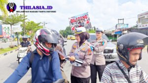 Dilokasi kegiatan terlihat Tim Satgas Preemtif OPS Keselamatan Lancang Kuning 2025 menyapa pengendara sembari membagikan brosur himbauan tertib berlalu lintas.
