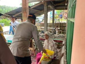 Setelah melakukan peninjauan, Kapolres Kuansing dan rombongan melanjutkan kegiatan dengan mengunjungi rumah warga terdampak longsor akibat meluapnya sungai. Salah satu warga yang menerima bantuan sembako adalah Hasni (62), yang rumahnya terdampak langsung oleh bencana tersebut.