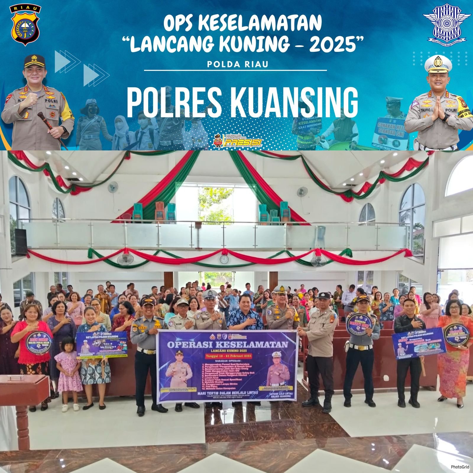Kapolres Kuantan Singingi AKBP Angga F. Herlambang, S.I.K., S.H., melalui Kasat Lantas Polres Kuansing, AKP A. Ramadhan, S.H., M.Si., memberikan edukasi kepada jemaat mengenai pentingnya keselamatan berlalu lintas serta menginformasikan bahwa Operasi Keselamatan Lancang Kuning 2025 akan berlangsung mulai 10 hingga 23 Februari 2025.