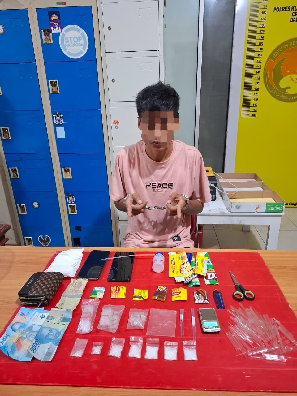 Sekitar pukul 19.45 WIB, tim melakukan penggerebekan di sebuah rumah kontrakan dan mengamankan seorang pria berinisial TH(23), warga setempat. Saat dilakukan penggeledahan, petugas menemukan satu dompet coklat berisi enam bungkus makanan ringan yang di dalamnya terdapat plastik klip bening berisi sabu. Selain itu, ditemukan pula satu paket sabu yang dibalut dengan uang pecahan Rp1.000,-. Total barang bukti yang diamankan berupa sabu dengan berat kotor 13,42 gram.