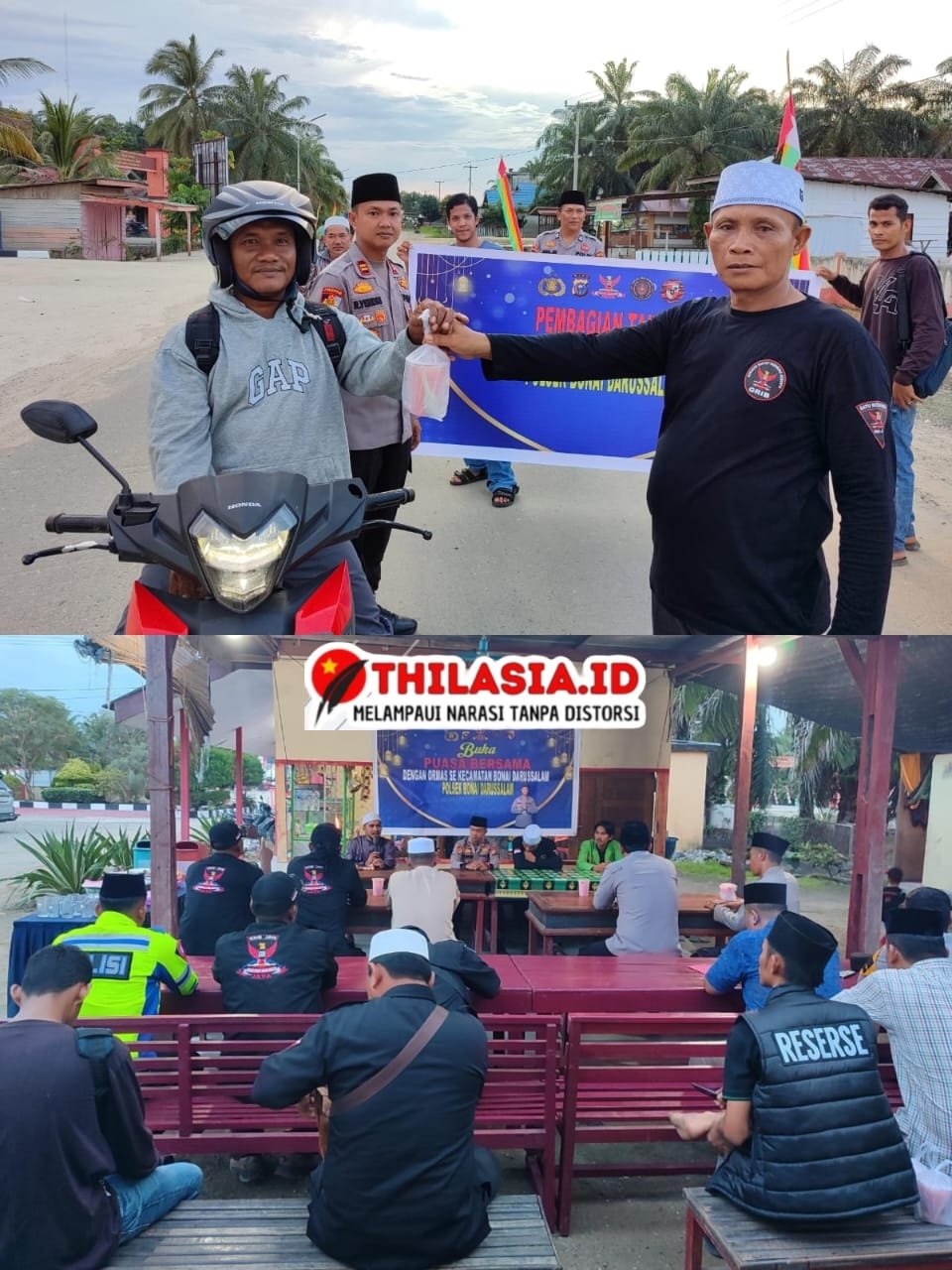 Kegiatan ini diawali dengan pembagian takjil kepada masyarakat yang melintas di Jalan Lintas Kumu – Duri, Desa Sontang, tepat di depan Mako Polsek Bonai Darussalam. Dengan penuh antusias, Kapolsek dan personelnya bersama Ormas dan Himpunan Mahasiswa turun langsung ke jalan membagikan hidangan berbuka kepada para pengguna jalan, sebagai bentuk kepedulian di bulan suci Ramadan.
