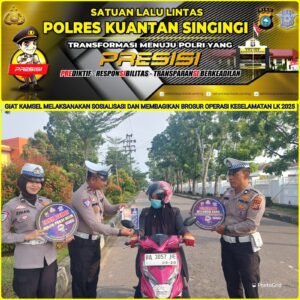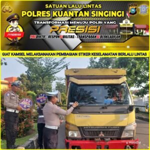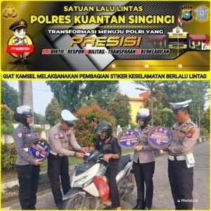 KUANTANSINGINGI, THILASIA.ID– Dalam upaya meningkatkan kesadaran masyarakat terhadap pentingnya keselamatan di jalan raya, Satuan Lalu Lintas (Sat Lantas) Polres Kuantan Singingi (Kuansing) melaksanakan kegiatan Kampanye Keselamatan, Pemasangan Stiker, serta Penyebaran Brosur Keselamatan Berlalu Lintas pada Kamis (27/2/2025) pukul 10.00 WIB di Jalan Proklamasi, tepatnya di Simpang Traffic Light, Teluk Kuantan, Kabupaten Kuansing.