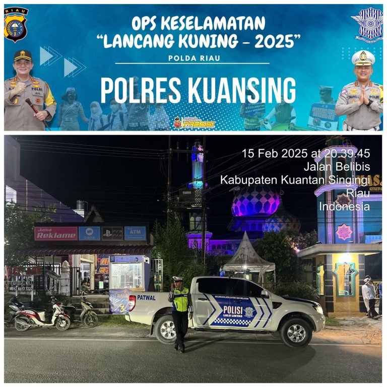 KUANTANSINGINGI, THILASIA.ID– Satuan Lalu Lintas (Sat Lantas) Polres Kuantan Singingi (Kuansing) melaksanakan Patroli Blue Light pada Sabtu (15/2/2025) malam dalam rangka Operasi Keselamatan Lancang Kuning (LK) 2025. Patroli ini bertujuan untuk mengantisipasi potensi gangguan keamanan dan keselamatan berlalu lintas, khususnya di daerah rawan kecelakaan lalu lintas (Laka Lantas), aksi balap liar, serta kejahatan jalanan atau C3 (Curat, Curas, Curanmor).