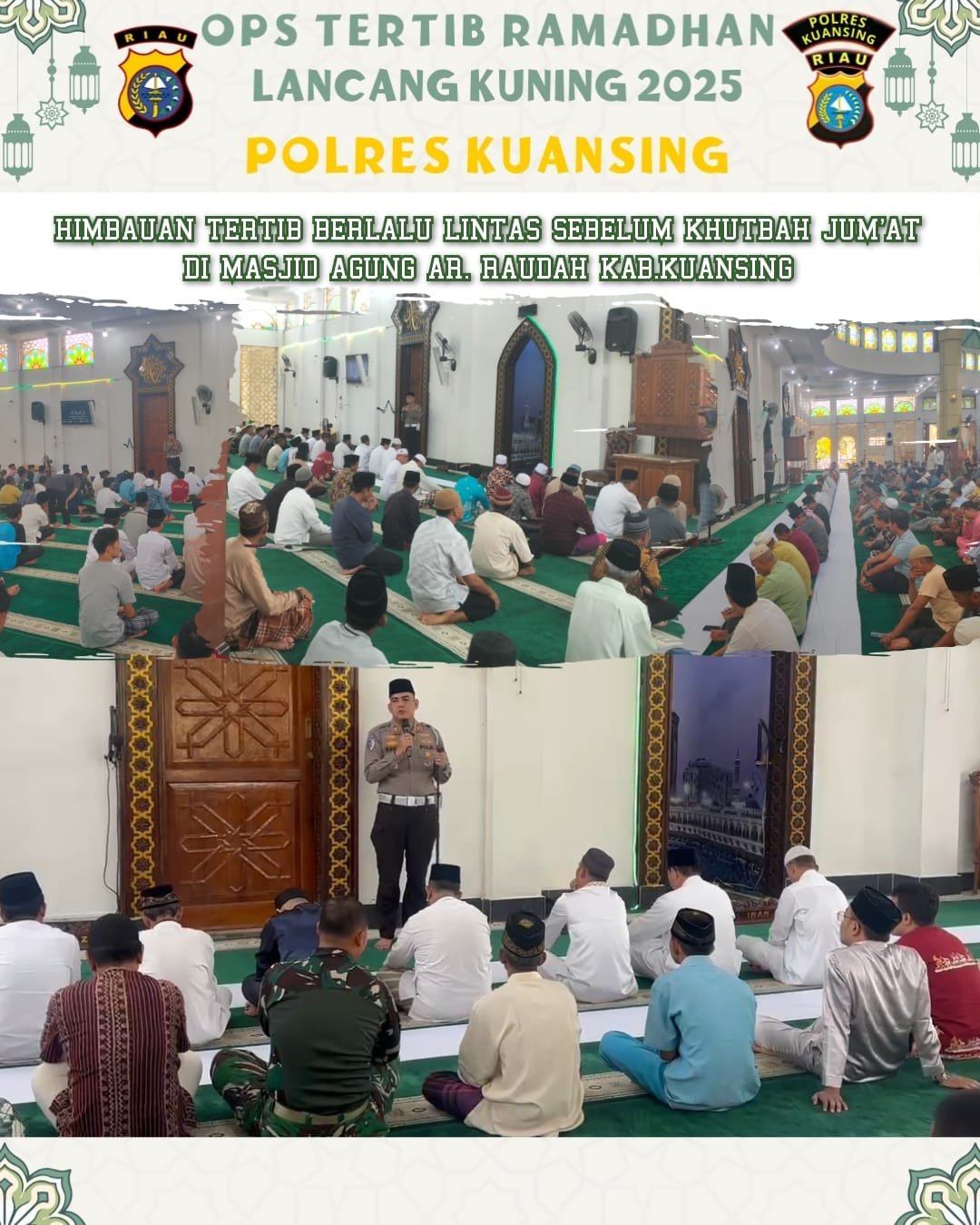 KUANTANSINGINGI, THILASIA.ID– Dalam rangka meningkatkan kesadaran masyarakat akan pentingnya keselamatan berlalu lintas selama bulan suci Ramadan, Polres Kuantan Singingi melalui Satuan Lalu Lintas (Satlantas) melaksanakan kegiatan himbauan tertib berlalu lintas sebelum khutbah salat Jumat.