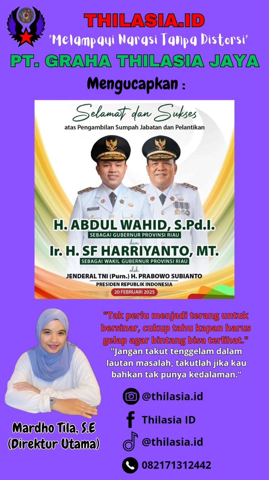 Thilasia.id sebagai media cetak dan online yang selalu mengawal perkembangan daerah turut mengucapkan selamat atas pelantikan ini. Harapan besar disematkan kepada pemimpin baru Riau agar dapat membawa perubahan positif dan mewujudkan pembangunan yang merata di seluruh wilayah.