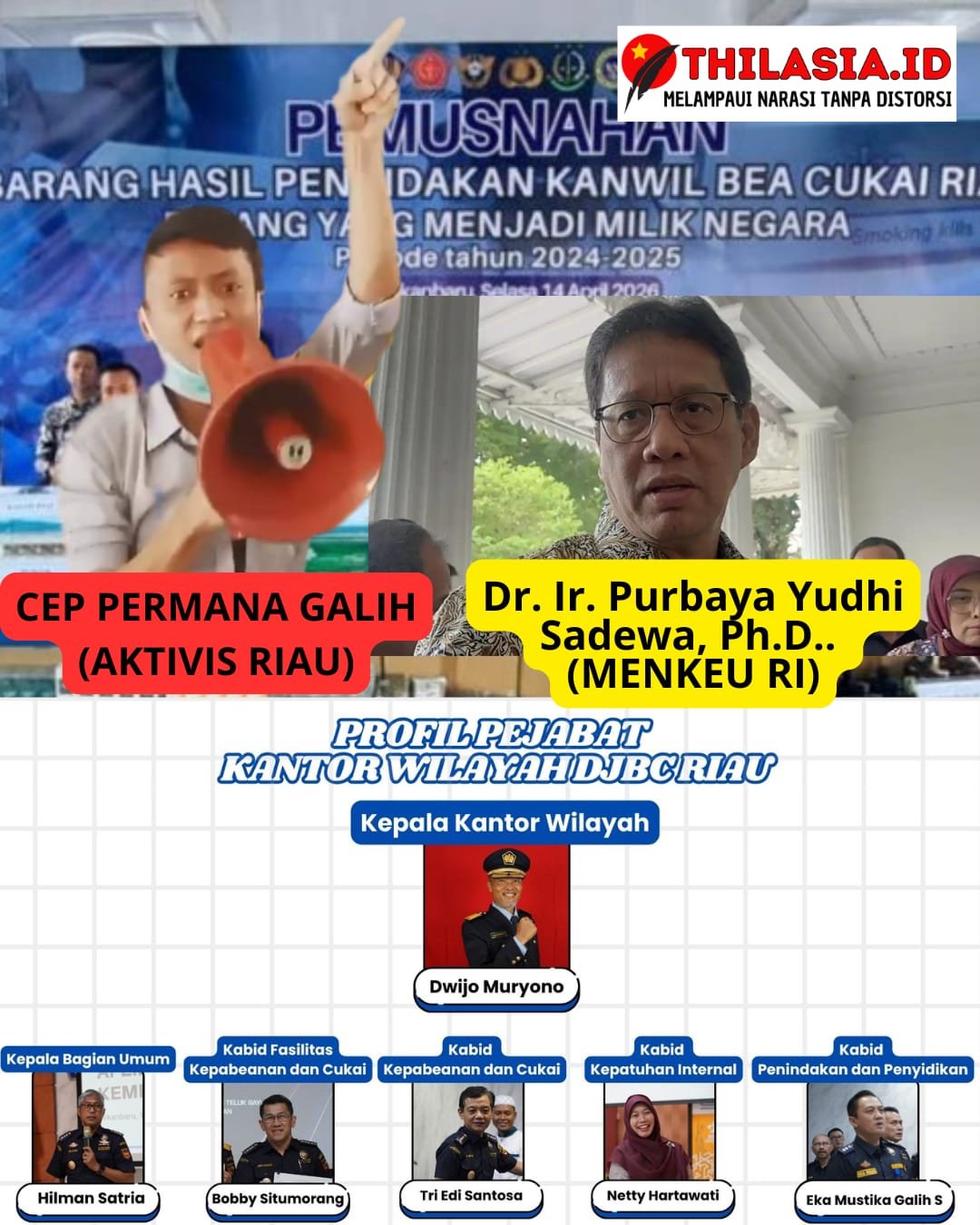 PEKANBARU |THILASIA.ID- Kantor Wilayah Direktorat Jenderal Bea dan Cukai (DJBC) Riau memusnahkan berbagai barang ilegal hasil penindakan dengan nilai fantastis mencapai Rp44,8 miliar (14/4/2026), namun tidak berhasil mengungkap jalur khusus pembuka jalan ilegal tersebut, bahkan kenapa bisa bocor. Kegagalan ini menjadi perhatian serius dari Aktivis Riau, Cep Permana Galih, karena yang diketahui Dwijo Muryono hanya 44,8 Miliar nilai barang ilegal, padahal diduga yang lolos tanpa ketangkap itu melebihi dari angka tersebut.